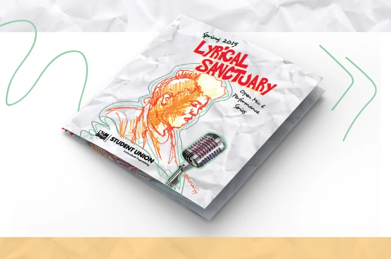 Lyrical Sanctuary is a monthly spoken word event at UWM. For every artist that goes up to the stage they have a guest artist, Ammar who will sketch the participants. So when designing the brochure for them I chose to follow his graffiti/ sketched style to create a high energy design.